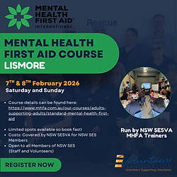 MHFA Course 7th & 8th February 2026 (Saturday and Sunday) Venue: Lismore SES Unit - 61 Brunswick Street Lismore Run by NSW SESVA MHFA Trainers - Teddy Haryjanto & Erin Pogmore Course details can be found here: https://www.mhfa.com.au/our-courses/adults-supporting-adults/standard-mental-health-first-aid Costs: Covered by NSW SESVA for NSW SES Members This MHFA Course is open to all Members of NSW SES - Staff and Volunteers Limited spots available so book fast! Further details will be sent once you have registered. If you have any questions please email office@nswsesva.org.au